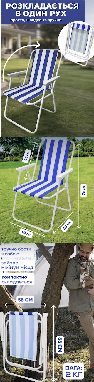 Мобільність: Розкладний стілець для відпочинку легкий та мобільний, що дозволяє переносити його з місця на місце.